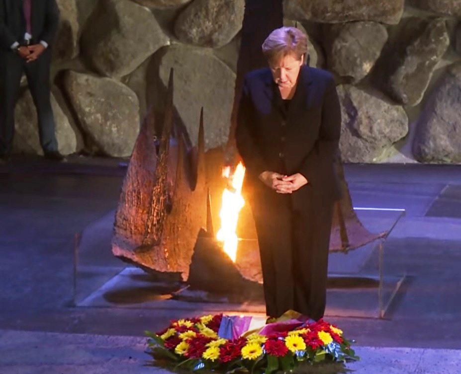 イスラエルの国立ホロコースト記念碑に献花するメルケル独首相(2021年10月)