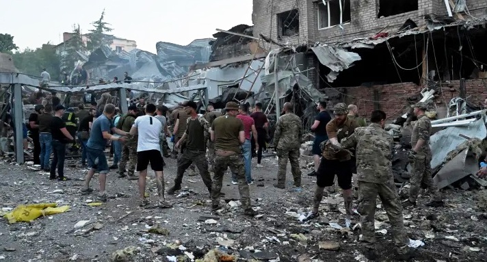 ウクライナ軍とロシアの戦闘が続くウクライナ東部クラマトルスクで被弾した住居から人々を救助するボランティア(2023年6月)