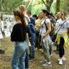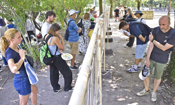「原爆と戦争展」パネルを参観する人々(6日、広島平和公園)