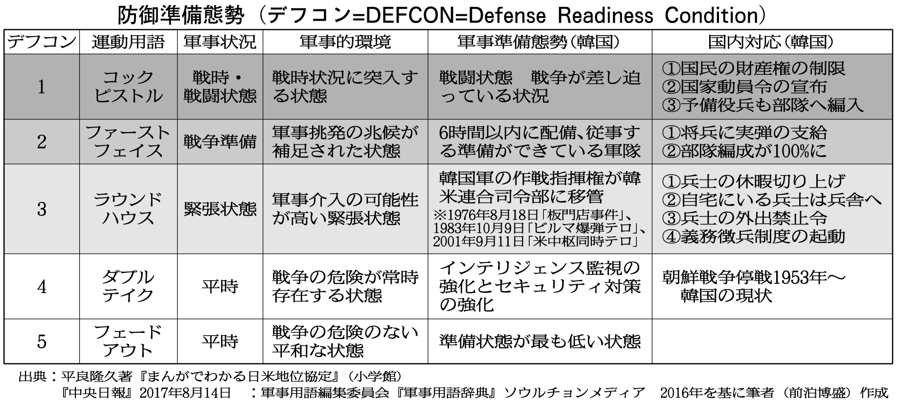 ※ちなみに日米地位協定にはデフコン規定はない。朝鮮戦争の最中に結ばれたこともあり「デフコン1=戦時・戦闘状態」を前提に、米軍最優先の協定内容となっている。(詳細は平良隆久著・前泊博盛監修『まんがでわかる日米地位協定』小学館)