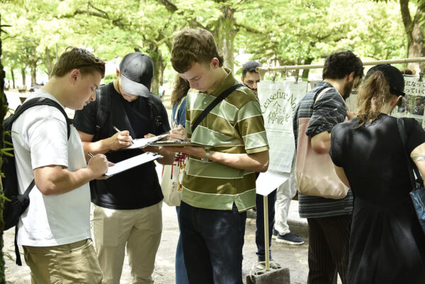 外国人参観者もアンケートに協力的で、自分から記入を申し出て空欄がないほど感想や意見を記す人も少なくなかった。アンケートの設問には、展示の感想や意見、さらに現在も世界で戦争や紛争、軍事緊張が続き、民間人が犠牲になっていることへの問題意識を尋ねている。とくに若い世代が過去の戦争を現在に続く問題として捉え、戦争を企む一部の資本家や為政者への強い憤りを記した。以下、外国人参観者のアンケートの一部を紹介する。