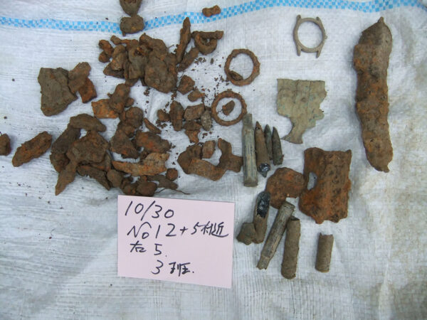 この写真【写真②】は、アメリカ軍の砲弾の5㌅艦砲弾の弾帯だ。そして60㍉迫撃砲。これはアメリカ軍の歩兵が進撃して日本軍とぶつかったときに味方の頭上を飛び越し、前方にいる日本軍に対して落としたロケット弾だ。これが出てくると私たちは慎重に掘るようにしている。なぜならこの場所でアメリカ軍と日本軍の歩兵同士の衝突があったことがわかるからだ。そうするとだいたい日本軍の遺骨が出てくる。そして、アメリカ軍の手榴弾の安全ピンを引き抜くときのリングだ。