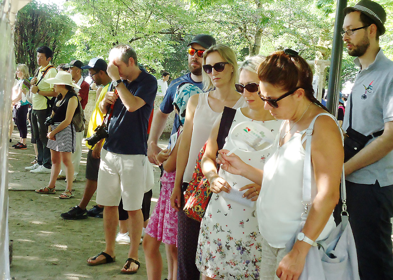 街頭原爆展を参観する外国人(昨年8月、広島平和公園)
