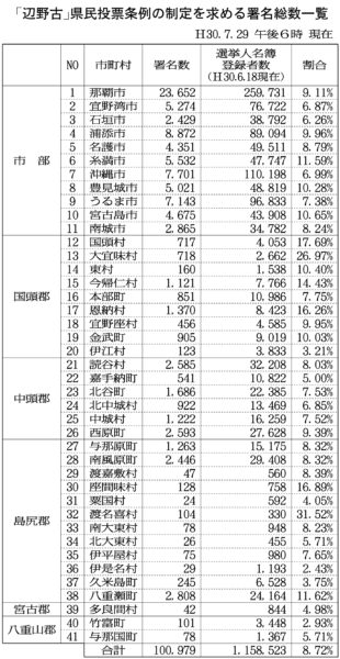 5月23日にはじまった「辺野古」県民投票条例の制定を求める署名運動は徐々に多くの市民の賛同を得て、署名期限である7月23日を終えた。その集計の結果、法定数を大幅に超えて10万979筆を集めた。これは1996年の県民投票(日米地位協定の見直し・米軍基地の整理縮小)の署名数(3万5603筆)を大きく上回るものであり、有権者比では8・72%となるものである。