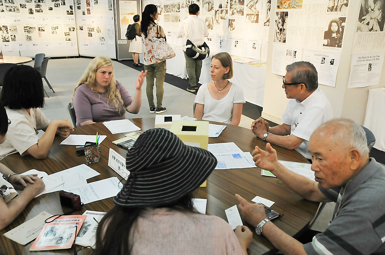 被爆者から体験を聞くドイツ人や米国人(広島原爆と戦争展会場)