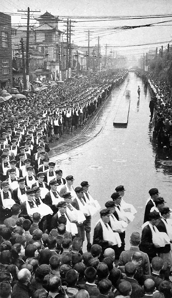 アッツ島で「玉砕」した兵士の遺骨(入っていなかった)を抱えた学生たちの列(1944年5月、札幌市中島公園)