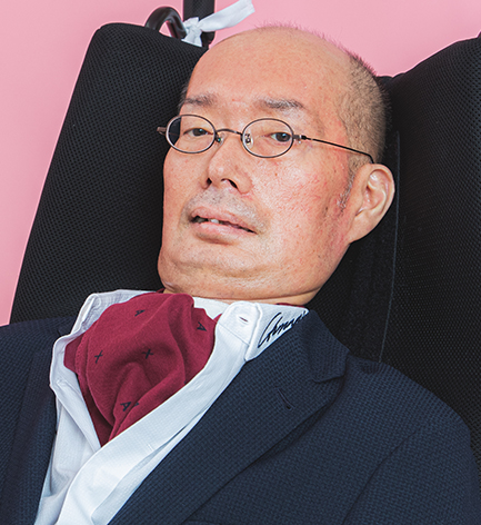 Yasuhiko was born on October 4th, 1957, in Gifu. He is an Amyotrophic Lateral Sclerosis (ALS) patient. He is also a generally paralyzed guitarist and the Vice President of Earth Inc. After graduating from Minami prefectural high school and then from Takushoku University with a degree in economics and political science, in 1982 Yasuhiko started his career as a salesman in Sakata Watchmakers Inc. In 1999, when he was 41 years old, Yasuhiko suddenly became unable to hold chopsticks, toothbrushes, and pens properly. The following year, in May, he was diagnosed with ALS. The paralysis spread through his body. In 2002, he wore an artificial respirator and a gastric fistula. In 2008, the last moving part of his body, the middle finger on his right hand, became paralyzed. Currently, Yasuhiko uses a teeth-based censor to operate his computer and creates poems, songs, and fairytales. He also uses a communication machine called “Den-no-Shin” to give public lectures. Yasuhiko lives in Tokiwa-daira, Matsudo.