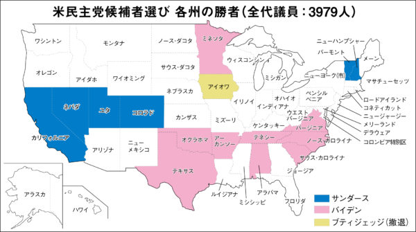 この日に先だって4州で予備選が実施された。初戦となった2月3日のアイオワ州(代議員数41人)党員集会では、元サウスベンド市長のブティジェッジとサンダースがともに25%で拮抗したものの90票差でブティジェッジが勝利。その後のニューハンプシャー州(同24人)とネバダ州(同36人)ではサンダースが、それぞれ25・7%、46・8%の最多得票で連勝した。この時点でサンダースの獲得代議員数は24人となり、バイデン(9人)に大きな差を付けてトップに躍り出た。