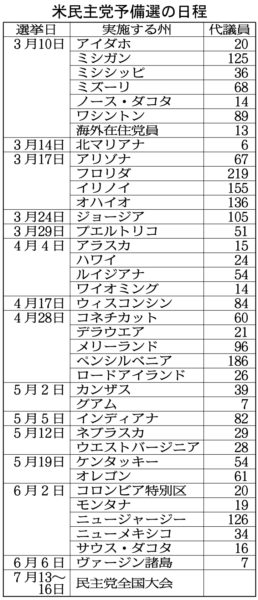 民主党の候補者指名は、全米50州やワシントン特別区などで実施される党員集会や予備選での獲得票に応じて配分される代議員の数によって決まる。代議員は7月の党全国集会で、各州予備選の結果に沿って投票しなければならない。今年各州に割り当てられた代議員数は3979人。この過半数にあたる1991人の代議員を獲得した候補者が党指名を手にすることができるシステムだ。そのため代議員数の多い大都市圏(民主党の地盤)での予備選の勝敗がその優劣を大きく左右する。
