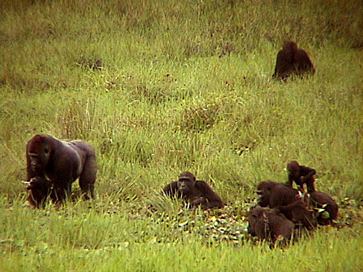湿地帯草原にいるゴリラの家族。左側にいるのが家族の長で、他はそのメスと子どもたち(西原氏撮影)