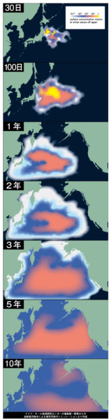 限定された条件のもとでのシミュレーションでも、放出の日から57日以内に放射性物質が太平洋の大部分の区域に拡散し、2年後には米国の西海岸付近がもっとも汚染され、10年後には全世界の海域に広がると指摘している。
