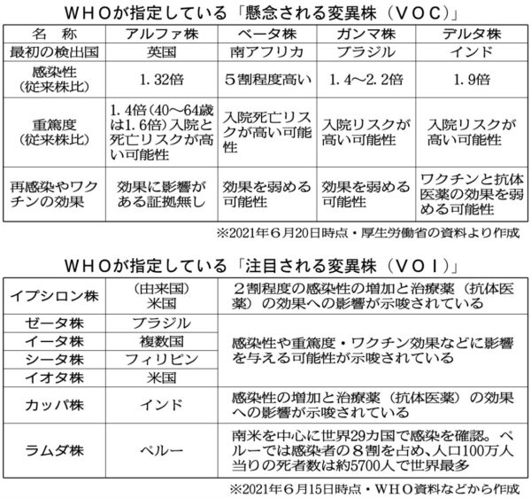 世界保健機関(WHO)は現在までに、実証データに基づいて警戒度が高いとする「懸念される変異株(VOC)」に4種を指定している【表参照】。すでに日本国内の感染者の大半を占めているアルファ株(英国株)、2つの変異を持つベータ株(南アフリカ株)、同じく2つの変異を持ち感染力の強いガンマ株(ブラジル株)、そして現在新たな脅威として世界中に広がりつつあるデルタ株(インド株)だ。また、エビデンスが限られているが警戒すべきウイルスとして「注目される変異株(VOI)」を複数種あげている【表参照】。