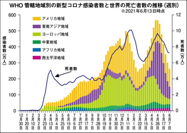 世界の感染状況【グラフ参照】を見ると、感染者数はピーク時よりも減少しているが再び増加している地域もみられる。死者数が高止まりしており、変異株の毒性の強さを物語っている。またアメリカ地域や東南アジア地域の感染者の割合が高く、ワクチン接種の進捗状況によっては、再び全体が増加に転じる可能性も秘めている。