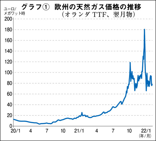 欧州の天然ガスの代表的指標といわれる「オランダTTF」先物相場は昨年12月、1㍗時当り180ユーロ(約2万2700円)を突破して過去最高値を記録。年初の7倍以上に達した【グラフ①参照】。