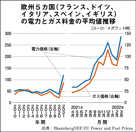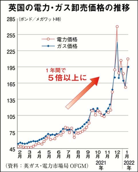 ところが、コロナ禍で停滞していた各国需要の回復によって原油・ガス価格が高騰していたところに、ロシア産原油や天然ガスの供給が滞ることへの懸念が価格をさらに押し上げ、英国における電力卸売り価格は1㍋㍗時当り250㍀(約4万円)以上に急騰【グラフ参照】。ガス価格も同様に1年前に比べて5倍以上の値上がりとなっている。これまで一般家庭で月額58㍀(当時のレートで9000円弱)程度だった電気代が、3月分から370㍀(約5万6000円)となった例もあるというから凄まじい負担増だ。