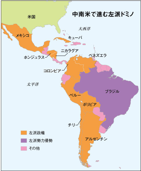 中南米の左派ドミノの経緯を見ると、1999年のベネズエラでのチャベス政権の成立後、2000年にチリのラグス政権、02年にブラジルのルラ政権、03年にアルゼンチンのキルチネル政権、06年にボリビアのモラレス政権、07年にエクアドルのコレア政権と続々と左派系政権が成立した。その後、チリ、ブラジル、ボリビア、エクアドル、アルゼンチンでは右派が政権をとり、揺れ戻した。だが18年のメキシコでのロペス・オブラドール政権の成立後、19年にアルゼンチンのフェルナンデス政権、20年にボリビアのアルセ政権、21年にペルーのカスティージョ政権、今年に入ってホンジュラスのカストロ政権、チリのボリッチ政権とふたたび左派政権が続々と成立したのに続く、コロンビアでのペトロ政権の誕生となった。