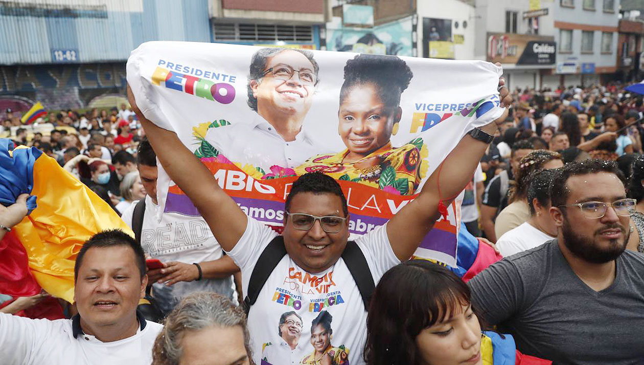 正副大統領選で勝利したゲスタボ・ペトロとフランシア・マルケスの写真を掲げるコロンビアの人々(6月)