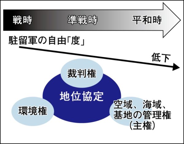 地位協定は、戦時、準戦時、平和時という時間の経過によって変化する【図参照】。戦時は駐留軍の主権が比較的大きいが、時間が経って平和時になれば、現地法の方がプレゼンスが大きくなる。主権が回復するのだから当然だ。ところが世界で唯一、戦時と関係性が変わらない地位協定がある。日米地位協定だ。