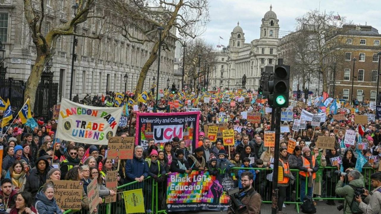 ロンドンのホワイトホールで開催された抗議集会に押し寄せたストライキ参加者と市民(1日)