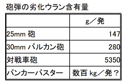 劣化ウランは天然ウランと比較すれば比放射能(単位重量当たりの放射能量)は6割程度だが、劣化ウラン弾のもっとも小さな砲弾である25㍉砲でも、1発の砲弾に 147㌘ の劣化ウランが含まれる。それは一般公衆の年摂取限度(11・4㍉㌘)の1万倍以上にのぼる。