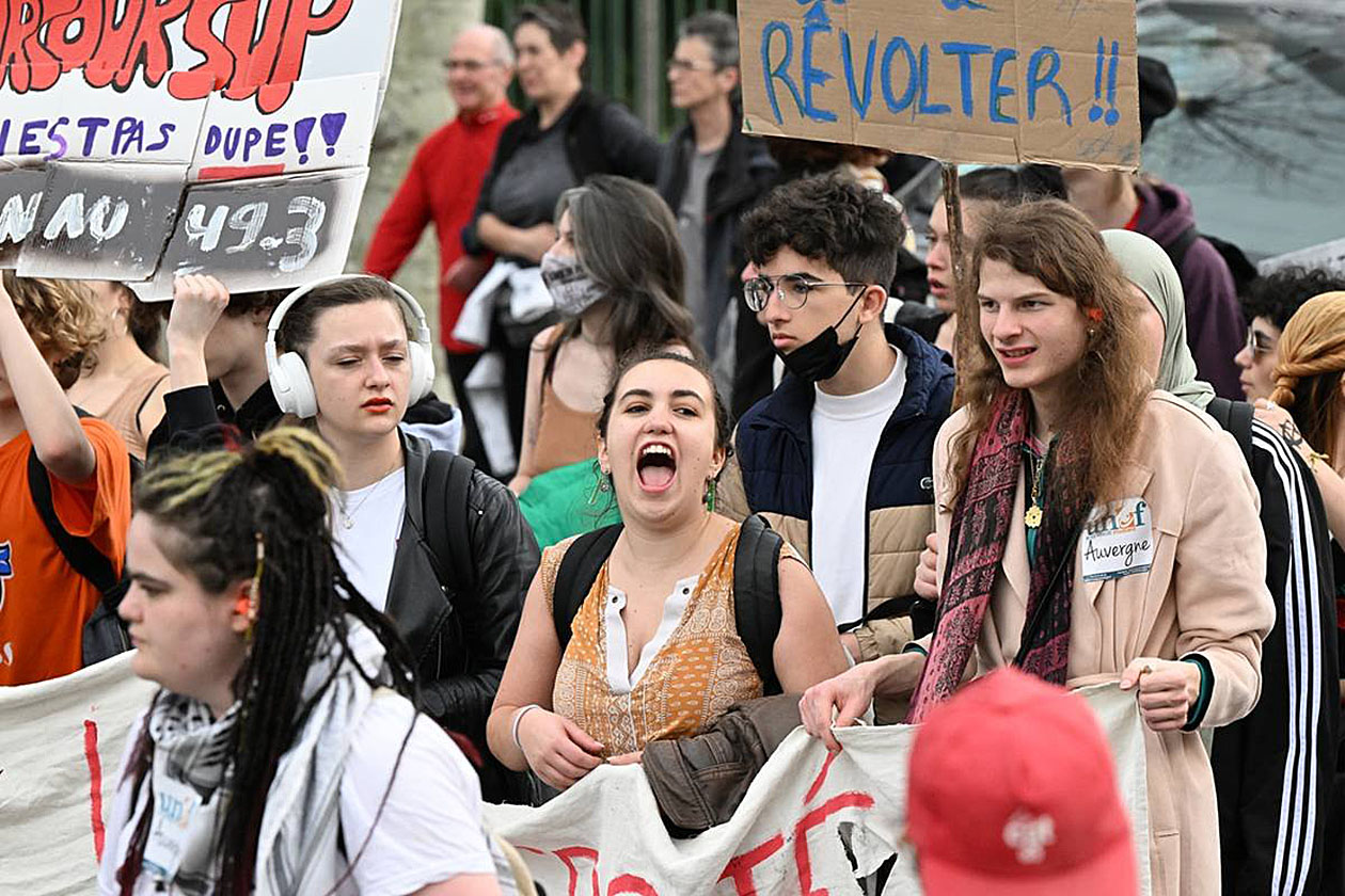 国会採決をしない憲法特例での年金改革の強行に抗議する若者たち(23日、クレルモン=フェラン)