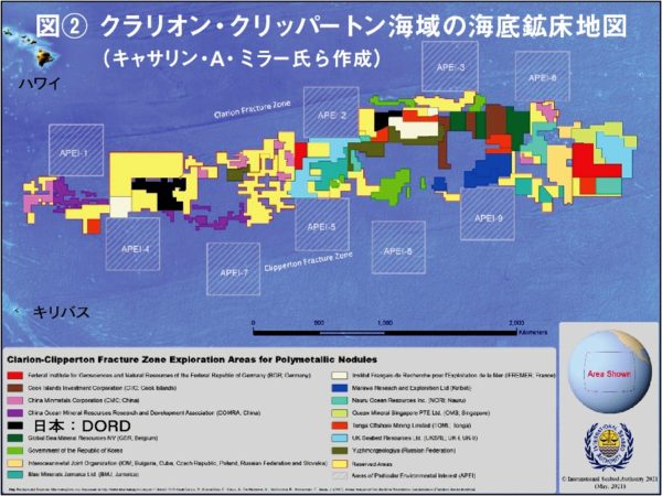 太平洋のハワイ沖にあるクラリオン・クリッパートン海域(CCZ。ここは公海)には、採掘のコンセッションとしてISAが指定している領域がある。【図②】のなかの線引きした海域を各国・各企業に売却しているわけだが、それを全部たすと、なんと米国の3分の1 の面積になる。