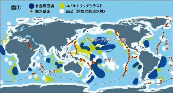 この地図は、以上の多金属団塊、コバルトリッチクラスト、熱水鉱床がそれぞれどこにあるかを示している【図①】。