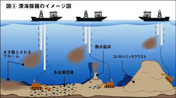 他に二つ、深海採掘の種類がある。一つはコバルトリッチクラストで、海底に皮殻のような硬い部分があり、そこにコバルトなどレアアースが含まれている。そこはサンゴやさまざまな生物が拠り所にしているところであり、そのことでエサ場になるために、マグロやサメなど大きな魚の生態系にとって重要な場所になっている。