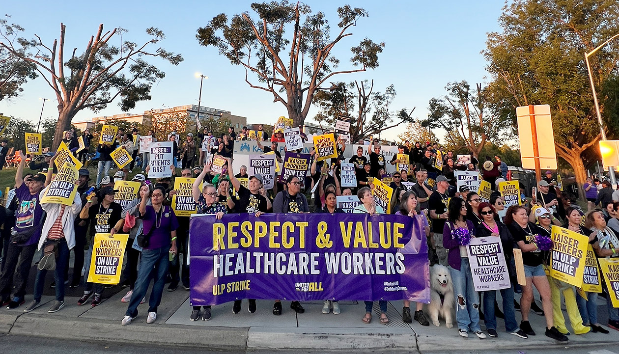 カイザー社病院前でピケを張る医療従事者たち(5日、サンタクララ)