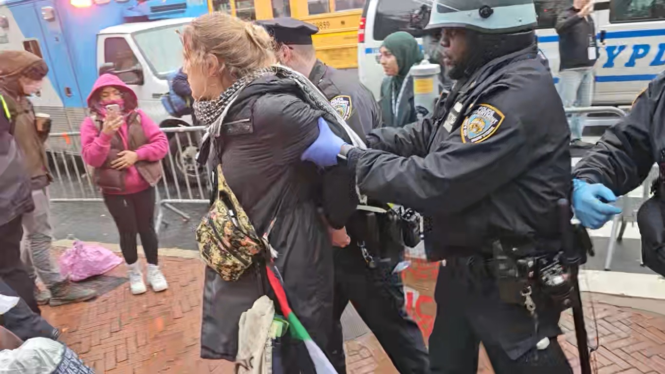 コロンビア大学の学生たちの抗議行動に連帯して路上でスタンディングをする市民を逮捕するニューヨーク市警(18日)