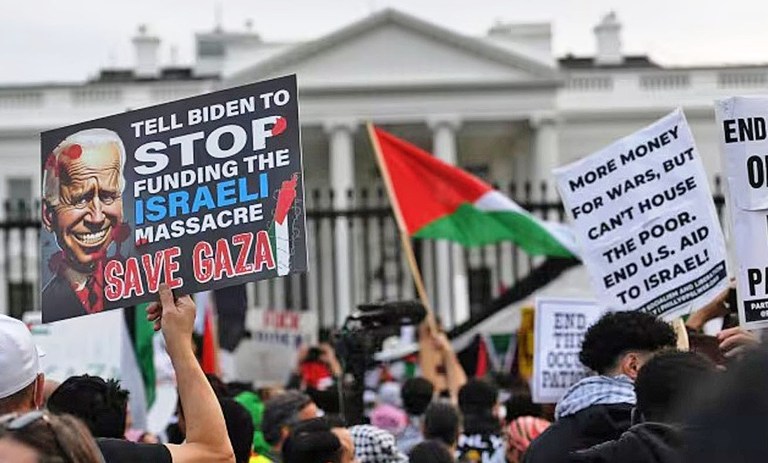 ㊤㊦ホワイトハウス前でイスラエルによるパレスチナでの虐殺に援助を続ける米国政府に抗議する人々(ワシントン、2023年11月)