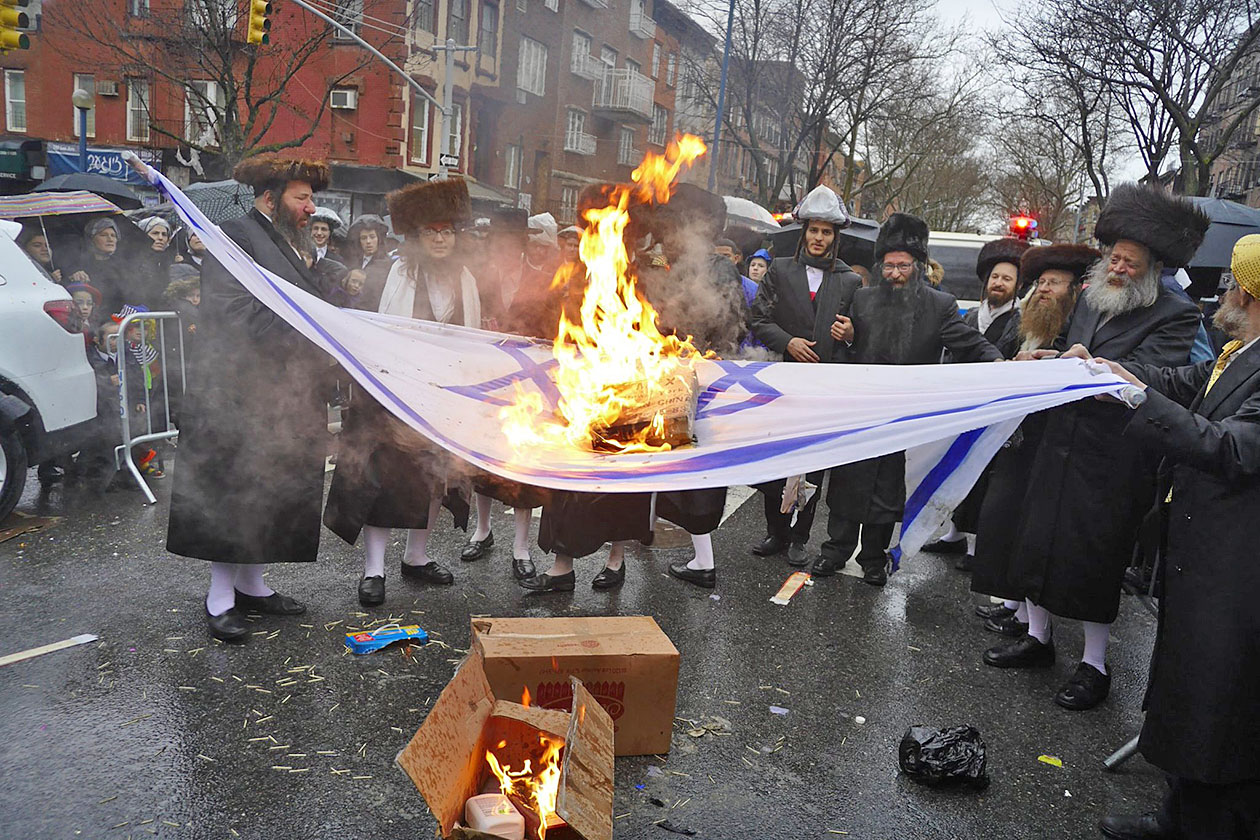 ニューヨーク・ブルックリンのウィリアムズバーグでシオニズムに反対してイスラエル国旗を燃やす正統派ユダヤ教徒たち(11月11日)