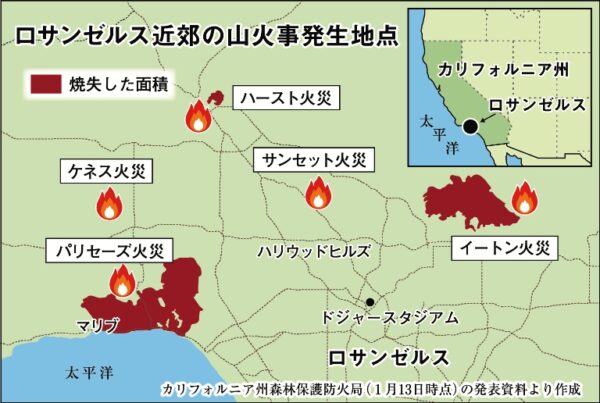 山火事は7日、ロサンゼルス西部の高級住宅地パシフィック・パリセーズの近郊から出火した。昨年来、何カ月も雨がほとんど降らなかった乾燥した南カリフォルニアで、「サンタ・アナの風」と呼ばれる強風にあおられて、プールやテニスコートを持つ家庭も多い高級住宅街はほぼすべての建物が焼け落ち、壊滅的な被害を受けた。山から海に向かった火の勢いが強く、海沿いの幹線道路には煙がもうもうと立ちこめ、沿道の飲食店や住宅も全焼したと報じられている。ハリウッドの有名俳優をはじめ、セレブたちも家を焼け出された。