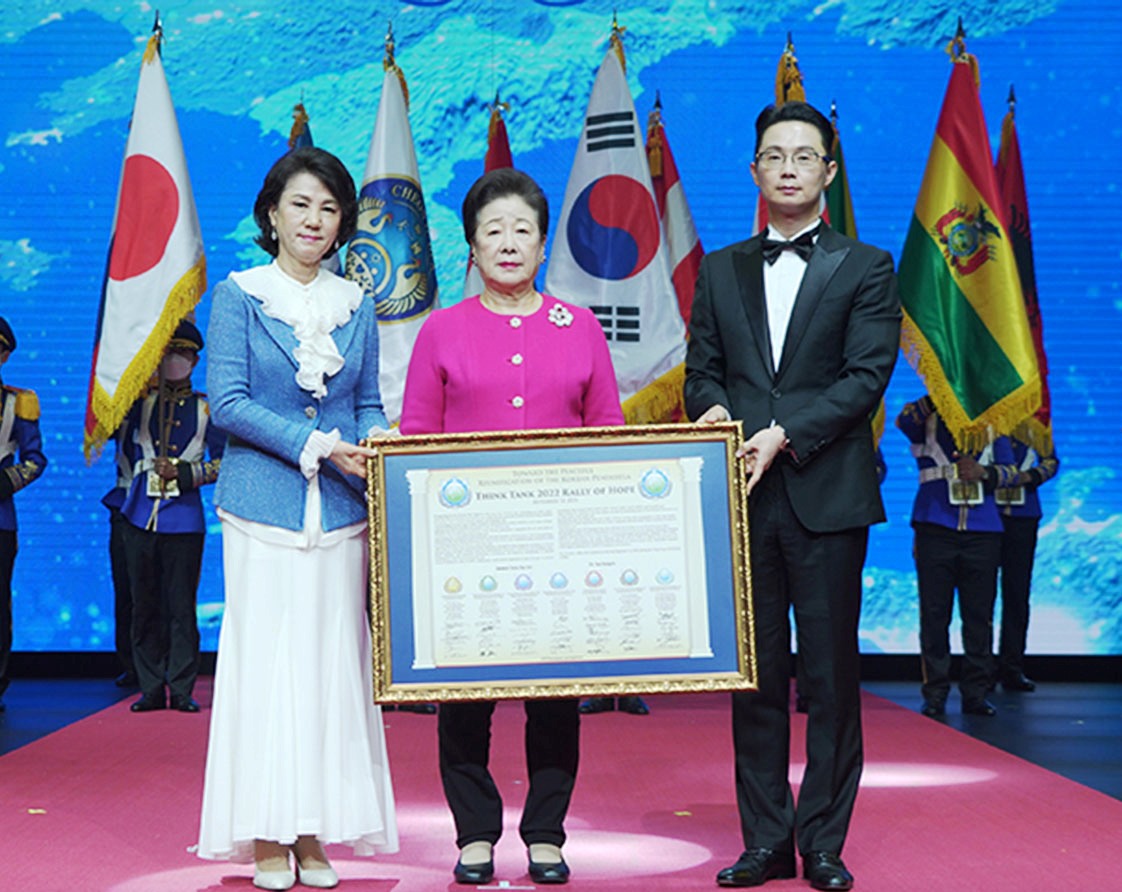 統一教会の韓鶴子総裁(中央)とユン・ヨンホ世界本部長(右)