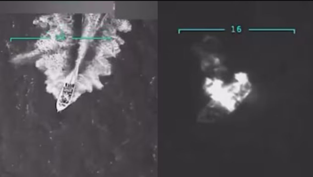 米軍がカリブ海でベネズエラの「麻薬密売船」として撃沈した船舶の映像(9月2日にトランプ大統領がSNSに投稿した動画より)
