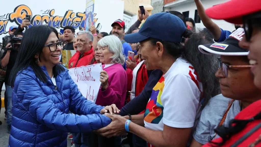 コムーナの住民代表らと握手するデルシー・ロドリゲス暫定大統領(7日、カラカス)