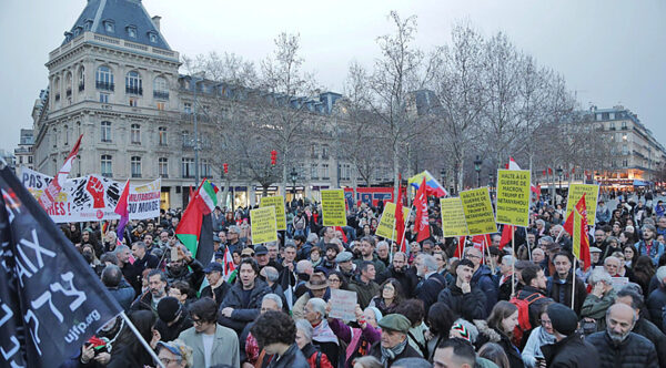 フランス首都パリのレピュブリック広場に人々が集まり、中東での戦争に抗議し、レバノン、ガザ、イランとの連帯を表明した(6日)