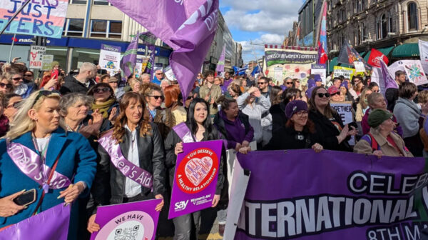 北アイルランドの首都ベルファストでも国際女性デー集会とともにイランへの侵略に抗議するデモがおこなわれた(8日)