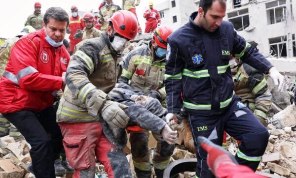 空爆によって破壊された家屋のガレキの中で捜索活動をおこなうイラン赤新月社の救急隊員たち(3月)