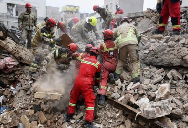 米国とイスラエルによる空爆がテヘラン各地の住宅街を襲い、破壊された家屋のガレキの中で救助隊員が生存者を捜索している(3月、イラン赤新月社)