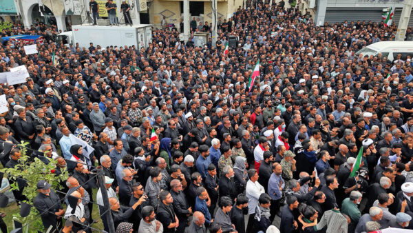 空爆犠牲者の棺を担いで弔うイランの市民(3月18日)