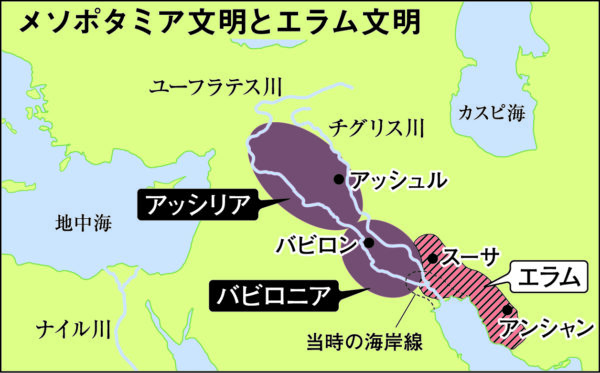 さらに下って紀元前4000年頃、世界最古の文明といわれるメソポタミア文明が、現在のイラクに当たるティグリス川とユーフラテス川の間の沖積平野で発展した。北部のアッシリア、南部のバビロニアに、シュメール人が都市国家を築いたのだ。