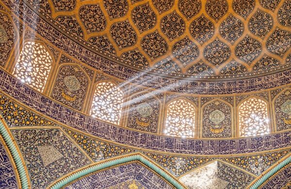 シァイフ・ルトゥフッラー・モスクの内壁。精緻なアラベスク模様とアラビア文字による美しい調和が形成されている(イスファハーン)