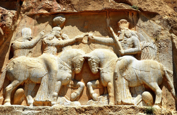 サーサーン朝アルダシール1世即位式のレリーフ。ナクシュ・ロスタム岩壁に刻まれている