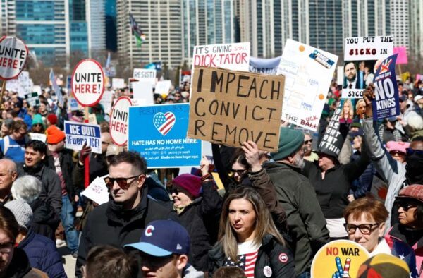 全米一斉の「ノー・キングス」集会で「弾劾、有罪判決、罷免」と書かれたプラカードを掲げる抗議者(3月28日、シカゴ)