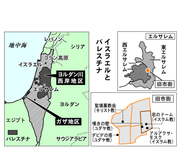 トランプのエルサレム首都認定にこれほど世界が反発するのは、歴史的な背景があるからにほかならない。エルサレムは聖書の預言者アブラハムにルーツを持つユダヤ教、イスラム教、キリスト教の3つの宗教の聖地である。現在も1㌔四方の壁に囲まれた旧市街に、古代ユダヤ王国の神殿の一部とされる「嘆きの壁」、イスラムの預言者ムハンマドが昇天したとされる「岩のドーム」、キリストの墓とされる場所に建てられた「聖墳墓教会」という3つの聖地が隣接してある(地図参照)。