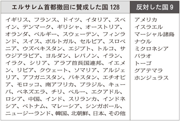 これに先だって18日の国連安全保障理事会では、エルサレムの首都認定は無効であるとして、トランプ政府に撤回を求める決議案をエジプトが提案した。アメリカの拒否権で廃案になったものの、それ以外の全14理事国が賛成し、安保理でアメリカが孤立する事態が生まれた。
