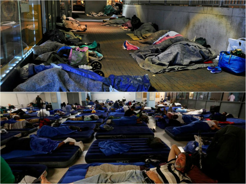 ㊤路上で寝るホームレス(ニューヨーク)、㊦行政が設置したシェルターベッド。入居待ちが続いている(ロサンゼルス2017年)