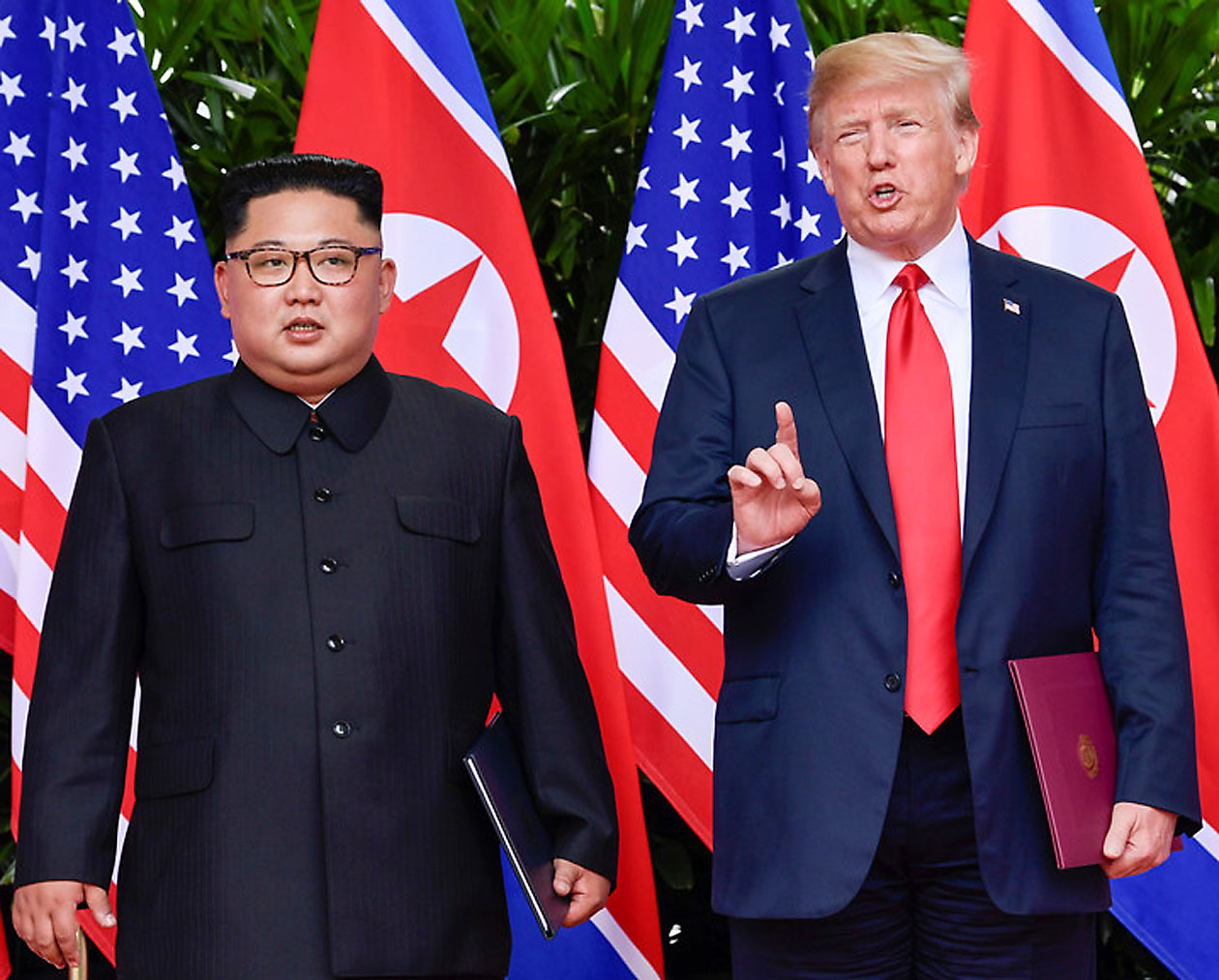 共同声明に署名したトランプと金正恩(12日、シンガポール)