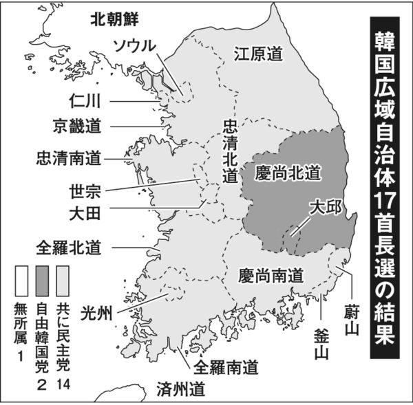 文政府誕生後初となった今回の選挙は、文在寅大統領の与党「共に民主党」が、国内人口の約半分が集中するソウル市、仁川市、京畿道の首都圏3カ所で全勝したほか、全羅道や忠清道、江原道など全17カ所のうち14カ所を抑え、事実上全国の地方自治体を掌握する大勝をおさめた。